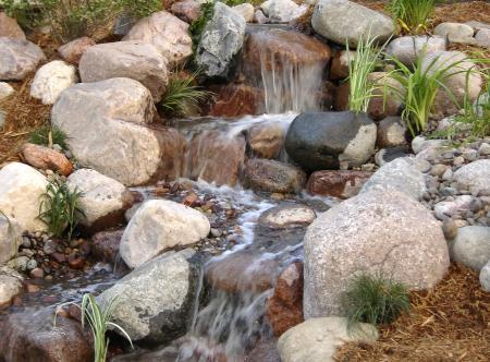 Natural Stone Waterfall And Stream Within This Water Garden Design